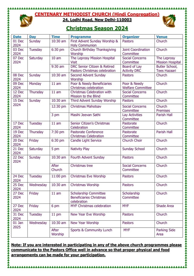 New Year Service of CMC Hindi congregation on 1st January at 10:30 a.m. followed by sports for children & youth.